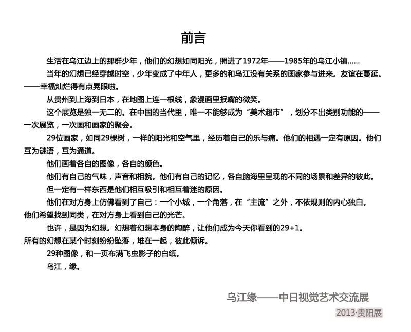 2013年8月18日下午,由上海现代艺术家陈墙、潘微,贵州著名油画家陈红旗、黄光辉联合发起,知名策展人彭天朗、伍艺空间创始人文心联合策展,“乌江源”展览策展工作组主办,伍艺空间、219文化创意广场大力协办的“乌江源”——中日视觉艺术交流展(2013·贵阳),在贵阳219文化创意广场举行开幕式,来自日本、上海和贵州的29位参展艺术家、各界嘉宾和省内外媒体朋友出席了此次开幕式。
