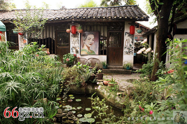青岩古镇建造在高低不平的山坡面上,所以从高处俯瞰,整个小镇会呈现一种在别的古镇中难以看到的立体美感。行走其中,踏足青石板铺成的古驿道,宽阔而平坦,洁净得一尘不染。年深日久,除却那些道观寺庙等公共建筑,民用的那些石砌房子多显低矮破旧,置身在这冰冷坚硬的石的世界,自然催生出人们对于柔软的渴求。于是,家家户户在自己的小院中广植花木,透过小小的门框,可以看到里面一派姹紫嫣红。