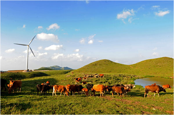童话里的风车转在荷兰,儿时的牧歌唱在蒙古大草原。红阳的风车是发电用的,它转呀转呀,转出了光明。红阳草场,坡连着坡,起起伏伏,连成了儿时的梦。