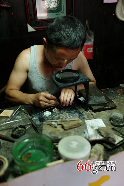 他叫杨胜益,凯里市湾水人,1972年出生在一个银匠世家,初中毕业后跟随父亲学习银饰制作,现已成家,有两个孩子,大女儿9岁,小儿子2岁多。十年前,经朋友介绍,远离家乡只身外出闯荡,先是在清镇从事银饰手工艺品加工制作,因生意不好,只好回到贵阳,在青岩古镇租了一个小门面,一边加工一边销售,开始时生意还可以,两年下来,虽不能说赚个盆满钵满,却也攒下了一笔可观的收入,到第三年,隔壁一家销品店卖假银饰品坑害顾客被媒体曝光,使得整个古镇的销品店一度受到很大影响,杨胜益的销品店也自然难逃厄运。是坐以待毙还是另谋出路?杨胜益选择了后者。于是,他抛家撇口,只身辗转去了成都,在成都做了一年,没想到生意还是不好做,一年下来也没赚到几个钱,连给妻儿买几件衣物的钱都差点拿不出来。无奈,只好收拾行囊回到贵州,几番市场调查后,本想在平坝县天龙古镇租一门面重操旧业,不曾想门面租金太高,难以承受。后来打听到安顺市西秀区云峰八寨屯堡文化旅游区游客较多,人流量较大,便于2007年来到云峰八寨旅游区的本寨,租下了一间民房,租房时间为5年,并与房主签下了每年2500元租金的租房协议,从此,杨胜益便一边开始银饰手工艺品加工制作,一边销售。凭着一身好手艺和诚实经营,生意最好时一个月可得到5000多元的纯收入。