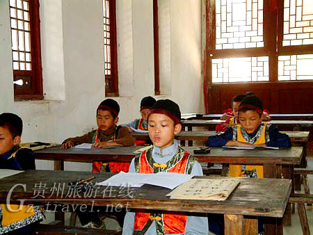 独山魁文阁更以它独特的文化风尚,浓浓的民族风情吸引着来到布依之乡的贵客。嘉宾们走进魁文阁,便被包围在一片歌海舞林之中,歌声舒缓、动听、一直伴随着客人们在魁文阁游览的脚步。斜雨楼、乡贤亭……四处皆歌、四处皆舞。在魁文阁里,身着古装的孩子们正在先生的带领下大声的朗读,神态恭敬,认真。