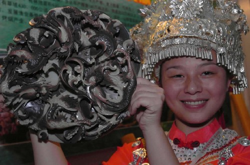 8月17日,在贵州安顺举行的黄果树瀑布节商品展示会上,一位苗族服务员正在向参加黄果树瀑布节的客人介绍用有14亿年成矿史的贵州铜仁地区梵净山的特产――紫袍玉带石做成的石雕。