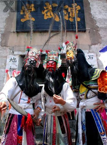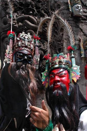 6月17日,在贵州省安顺市天龙镇演武堂外,演员展示地戏造型。