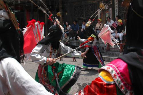 6月17日,演员在贵州省安顺市天龙镇演武堂为游客表演地戏《楚汉相争》。