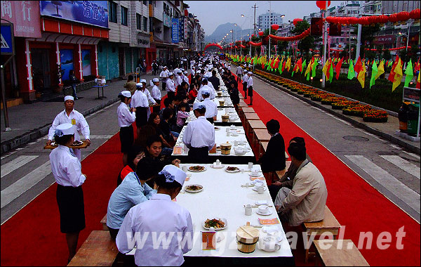 下午5:30,在长达1公里的清真全牛宴上座无虚席,凉拌牛肉、牛干巴、烩牛肠、牛脑汤、红烧牛尾等十几种牛肉餐,让在场数百名群众着实地体验了清真饮食文化内涵。期间,上海大世界基尼斯中心对“参与人数最多的清真全牛宴”进行了现场认证,并颁发“大世界基尼斯之最”证书。