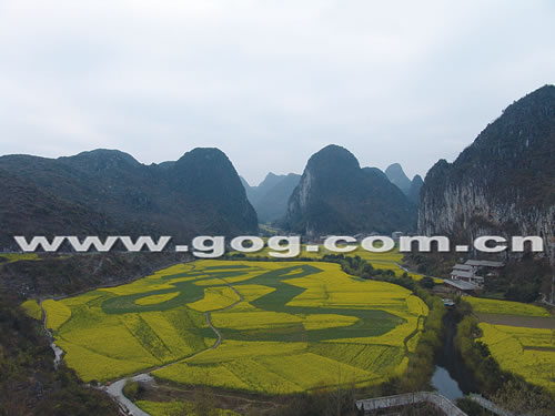 昨日,记者在龙宫风景区看到,为迎接中国生态旅游年暨第七届贵州油菜花旅游节,龙宫风景区在主会场漩塘景区精心用油菜花与蚕豆套种了一个巨大而狂放的“龙”字,从观赏点眺望,美景和艺术相得益彰。