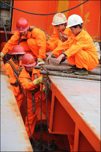 5月18日,工人在贵州坝陵河特大桥上施工。