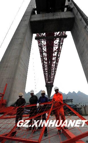 6月21日,在贵州坝陵河特大桥修建现场,几位工人正在吊装护栏。