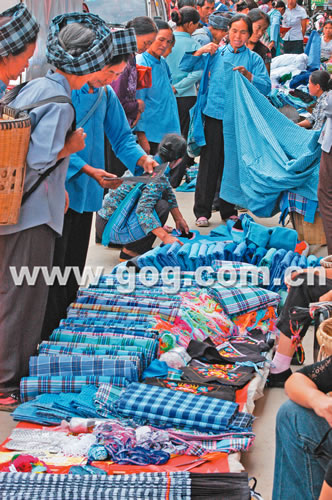 ¹ØÁë×ÔÖÎÏØ°ËµÂÏç²¼ÒÀ×帾ٱàÖ¯µÄ°Ë¸ñ»¨²¼ÇàÀ¶µÑÅ£¬×ö¹¤¾«ÃÀ£¬ËýÃǽ«×Ô±àµÄ»¨²¼ºÍÐåÆ·ÍÆÏòÊг¡£¬ÉîÊܲ¼ÒÀ×å´åÃñºÍ¸÷µØÓοÍϲ°®£¬±àÖ¯»§Ã¿Äê¿ÉÔöÊÕÉÏǧԪ¡£Í¼Îª²¼ÒÀ×å´åÃñÔÚÑ¡¹º°Ë¸ñ»¨²¼¡£