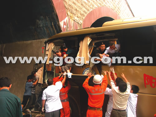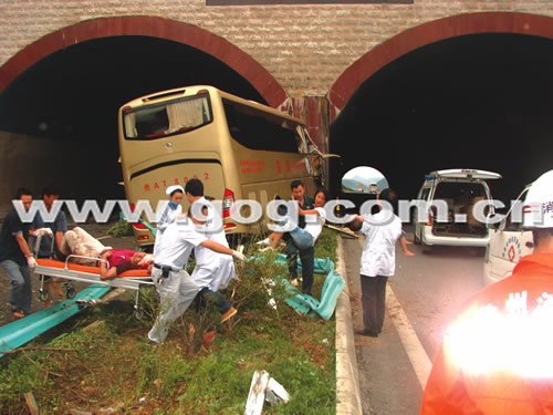 上午11时,记者接到报料赶到现场时,肇事的贵at800x旅游客车内受伤的游客已被急救车送往医院救治,交警对现场进行了交通管制,双向过往车辆在交警指挥下缓慢通行。记者看到,肇事的旅游客车在撞倒近20米长的中间隔栏后,一头撞在了两个隧道中间的墙上,车头被撞扁严重变形,车体前的几排座位,基本上全部叠压在了一起,路面上洒满了碎玻璃、坐椅等物。