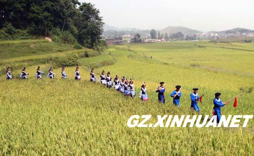 2009年8月31日,贵州平坝苗族群众参加“米花节”活动的芦笙队走在扬花的稻田里。