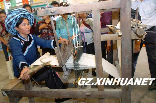 一位布依族妇女正在现场展示布依族棉布的纺织过程。