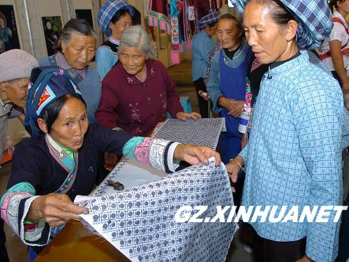 一位布依族妇女在展示她亲手制作的蜡染工艺品。