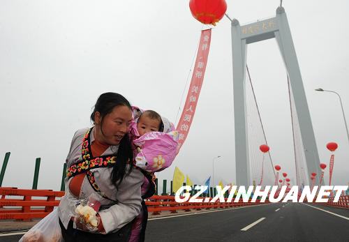 2009年12月23日,一名当地妇女背着孩子前来观看坝陵河大桥通车。