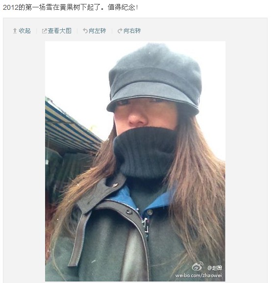 本网讯 著名女演员赵薇昨日(1月4日)到本省的著名景区黄果树,贵州黄果树瀑布下起了2012年的第一场雪。俗话说“瑞雪兆丰年”,对于这开年的第一场雪,正在此地游玩的赵薇也情不自禁的在微博中自拍留念,许多粉丝纷纷前来围观。