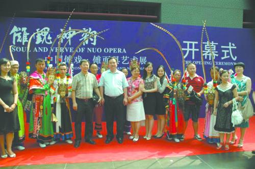 据介绍,展览分为“傩的历史”、“傩戏艺术”和“傩面具艺术”三个单元,共展出各式珍贵的文物近500件,包括傩戏表演时使用的傩案、法印、铃铛、牛角枚等道具和古朴精致的傩戏服装,以及来自藏、仡佬、苗、壮、土家、毛南等多个少数民族的傩面具,展览期间安顺屯堡地戏在国家大剧院演出6天15场,将贵州最古朴、原始的原生态戏曲以戏剧形式展现给在场观众。