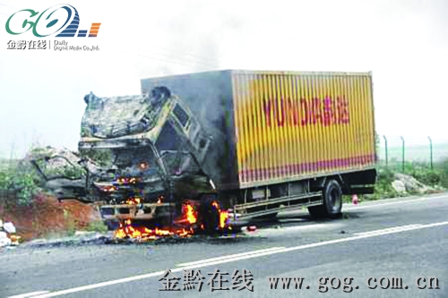 5月9日上午,一辆韵达快递公司的满载包裹的大货车在沪昆高速安顺段突然起火燃烧。尽管消防官兵及时赶到救火,但货车内的大量邮件包裹还是被焚毁。