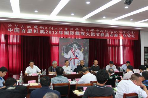 8月10日,百里杜鹃2012年国际彝族火把节布摩文化论坛隆重开坛,省人大常委会副主任顾久,省人大常委会原副主任、省彝学会会长禄文斌,省人大常委会环资委委员、省彝学会副会长、市彝学会会长禄绍康,市人大常委会副主任倪小兵,市人大常委会副主任、百里杜鹃党工委书记黄家耀,党工委副书记、管委会主任熊灿平及来自北京、四川、云南、贵州的彝族布摩代表和彝学专家学者近百人参加论坛。