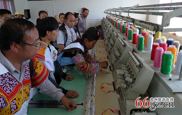 贵州旅游在线讯 在2013年旅游旺季,毕节市大方县黔西北民族文化旅游工艺品厂成为贵州旅游的新亮点。操作间的12台绣花机同时作业,几分钟就绣出芦笙、蝴蝶、牛角等各种民族文化图案和自然山水风光,五彩缤纷、惟妙惟肖,其速度之快、绣品之精美,令人叹为观止。该厂由大学毕业后回村的苗族共产党员马识全带领苗族返乡农民工合资兴建,以研发生产民族旅游工艺品,既传承民族文化,又解决农民就业,为民族地区村民开辟一条致富之路。