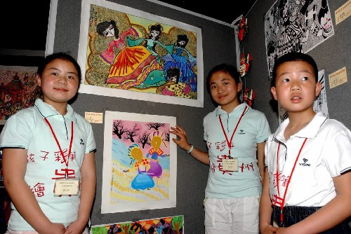 5月2日,来自贵州的小画家们在展示自己的绘画作品。
