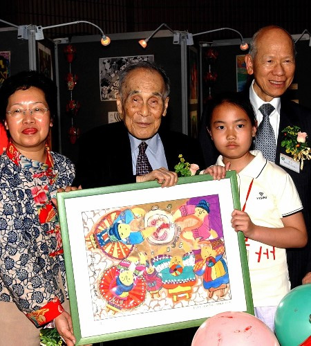 5月2日,11岁的贵州小画家廖兴鸿(前右一)将自己的作品赠送给年逾九旬的香港普宁同乡联谊会创会会长庄世平(左二)。5月2日,香港市民在参观贵州小画家创作的艺术作品。