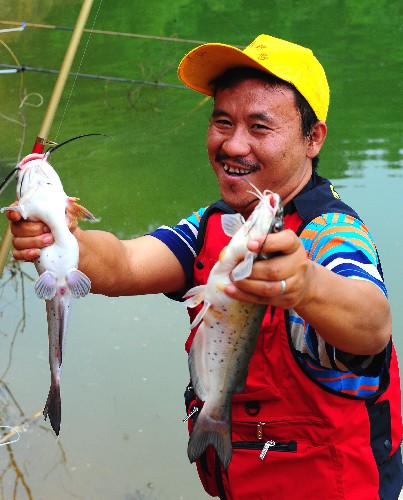 10月14日,来自湖南省湘西的钓鱼爱好者彭建国在展示刚钓到的两条鱼。