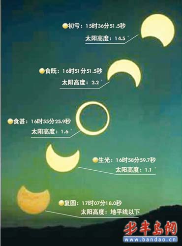 500年一遇的日全食过去近半年之后,市民又有望看到一场日环食,届时太阳的中心部分黑暗,边缘却仍然明亮,在天空中形成一个耀眼的光环。12月13日,记者从青岛观象台了解到,2010年1月15日将出现日环食,山东省正处日环食带上,当天在青岛可见遮挡率达90.679%的日环食,太阳随后“带食而落”。
