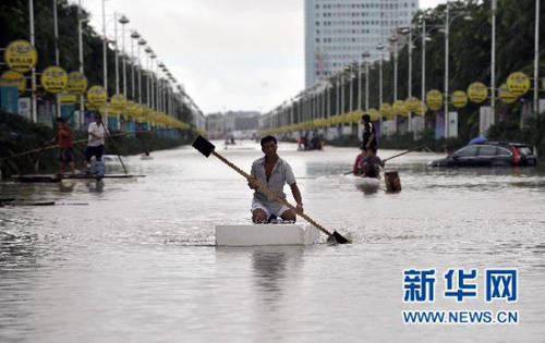 10月6日,琼海居民乘自制的小船通过市内积水路段。新华社记者郭程摄