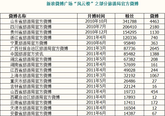 目前,河北、江苏、安徽、湖北、海南、云南、青海、西藏等省区市的旅游局,以及更多地方旅游部门都已开通官方微博。
