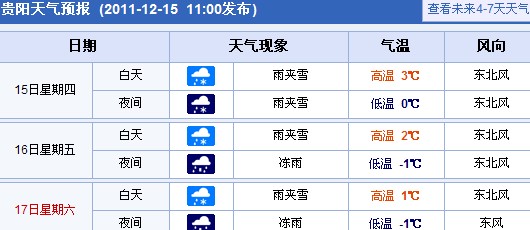 贵阳今天的气温也会继续下降,晚上冻雨卷土重来。今天白天阴天有小雨夹雪,晚上冻雨转雨夹雪,气温3~0℃,偏北风2~3级,相对湿度80~95%。
