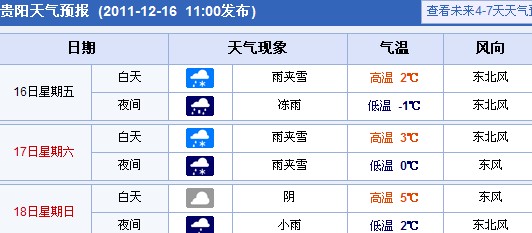 贵阳今天冻雨转雨夹雪,气温-1—2℃,周六雨夹雪,温度1—3℃,周日阴有小雨,温度有所回升,2—5℃。