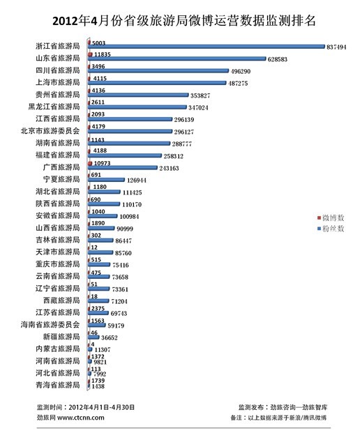 根据劲旅咨询-劲旅智库对全国省级旅游局微博运营数据监测结果显示,在2012年4月1日至30日期间,省级旅游局微博粉丝数排名前十位的分别是:浙江省旅游局、山东省旅游局、四川省旅游局、上海市旅游局、贵州省旅游局、黑龙江省旅游局、江西省旅游局、北京市旅游委员会、湖南省旅游局以及福建省旅游局。