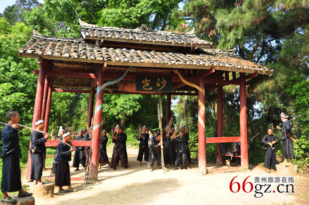 岜沙苗寨,坐落在贵州省从江县海拔550米的山坳上,岜沙人分住在月亮山麓茫茫林海中的5个寨子里,有300余户人家。走进岜沙,随处可见茂密的森林。他们以稻作为主,狩猎为伴。这里箐黑林密,鸟道蚕丛,具有很强的隐蔽性。岜沙村不大,村寨建于山粱坳口及面向都柳江一侧的半坡上。村寨木楼古朴、简单;四周则为密林环绕,环境幽雅;村民全系苗族,衣着传统,发势奇特。