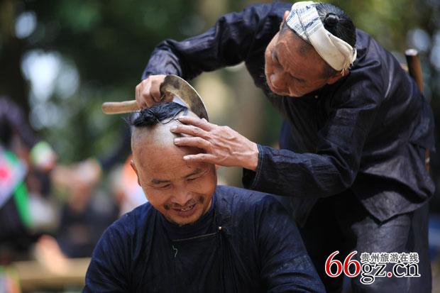 岜沙苗寨,坐落在贵州省黔东南州从江县海拔550米的山坳上,岜沙人分住在月亮山麓茫茫林海中的5个寨子里,有300余户人家。走进岜沙,随处可见茂密的森林。凡是到过岜沙旅游的人一定不会忘记岜沙汉子那精彩绝伦的“镰刀剃头”,岜沙苗寨的男子们保留着古老的镰刀剃头习俗和古代发式。岜沙汉子均蓄留发髻,盘于头顶,四周头发从脖子至耳后全部剃光,这样的发型是用割草的镰刀在头皮上剃出来的,可谓是中国最古老的剃头方式。