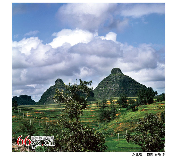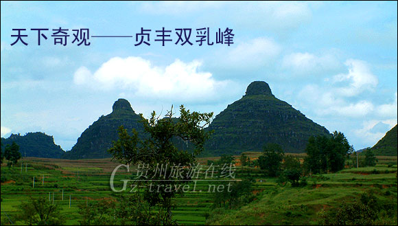 双乳峰位于贵州省贞丰县城境内,离县城9公里,处于贞丰至贵阳的公路干线上。双乳峰,因酷似大地母亲袒露的双乳而得名,占地40公顷,高度相等,均海拔1266米,高出地面125米;双峰上的两个“乳头”也高度相等,各高近10米。两座兀立的石峰形同女性丰满的双乳,且逼真得让女人看了脸红,男人看了心跳,被当地布依族称为“圣母峰”,被世人誉为“天下第一奇峰”。
