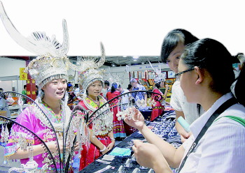 “我们是贵州省黔东南的苗族。这次,我们共带来了三四百种款式的苗族饰物。”现场的负责人龙明英介绍说,另外,他们还带来了一件苗族特有的传统刺绣服装,可惜没有展示的衣架。