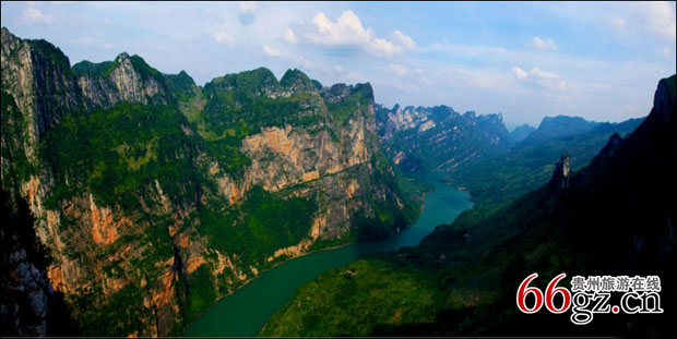 北盘江大峡谷位于贵州省六盘水市水城县境内。集峡谷风光之大成,以系列喀斯特及丹霞地貌大峡谷景观著称,为贵州峡谷之最。《中国国家地理》2011年第10期评选“中国喀斯特景观之最”的最美喀斯特峡谷,北盘江大峡谷榜上有名。这条峡谷集峰林、溶洞、怪石、瀑布、伏流、花滩、旋塘和原始森林植被于一体,既有长江三峡的秀丽险峻,也有美国科罗拉多大峡谷的雄奇壮美。在这段峡谷中,还萦绕着远古壁画、古城遗址等夜郎文化之谜,以及铁索桥、摩崖石刻、古驿道等人文景观。可以说,北盘江大峡谷是贵州西部旅游线上的一个新亮点。也是“迂回曲折的画廊”和“两岸猿声啼不住,轻舟已过万重山”的再现。特别是关兴高等级公路上的北盘江特大桥,桥长486米,大桥高388米,是亚洲同类桥中的第一高桥。给人再现一种“一桥飞架南北,天堑变通途”的感觉,从大桥上俯瞰深隧幽长的大峡谷,给人一种“天沟地缝”的感觉。近千米高、几公里长的斧削绝壁犹如波澜壮阔、气势磅礴的巨幅长廊壁画。特别是在雾气朦胧、烟云缭绕的时候,给人更是一种仙境般的感觉。