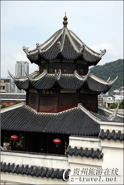 道教庙宇。在贵州省贵阳市东门月城上。始建于明代万历三十七年 1609),清代康熙八年(1669)重修,雍正、乾隆、嘉庆、道光时均有维修和扩建。该阁是一座九角三层宝塔形建筑,两边设有配殿,前为联结配殿的斋房,平面布局成四合院形。主楼高约20米,面阔11.47米,进深11.58米,为三层三檐、不等边九角攒尖顶,各层插拱较多,斗呈曲线,翘角不高,窗花和枋板施有彩绘,其建筑风格颇具地方特色。原为供奉文昌帝君之所,现是贵阳文物保护单位。