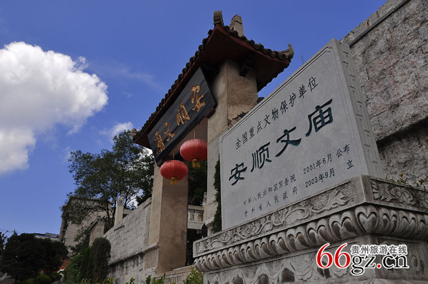 安顺文庙位于贵州省安顺市东北之黉学坝。始建于明代洪武初年,几次增建、修复,臻于完备,现存建筑22处。占地约8000平方米,沿中轴线依次抬升对称分布的,是一座规模宏大、布局严谨、庄严典雅的古建筑群。建筑群。1982年,贵州省人民政府核定公布为省级文物保护单位。是现今中国保存下来的建筑最完整、艺术性最高的文庙之一。
