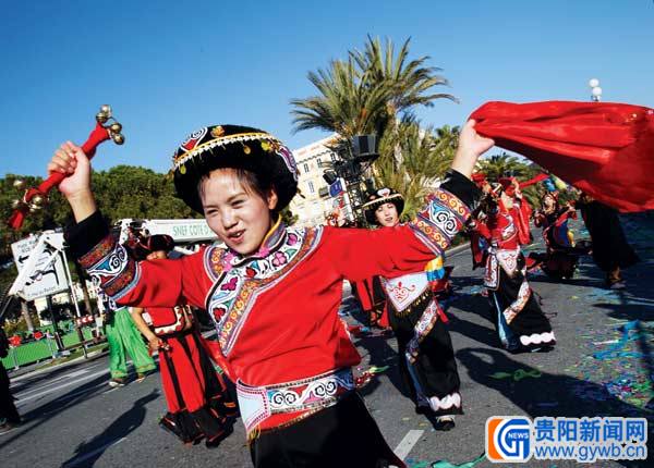 3月2日,在法国南部海滨城市尼斯,来自贵州省六盘水钟山区歌舞团的演员在狂欢节游行上表演了“彝族铃铛舞”。