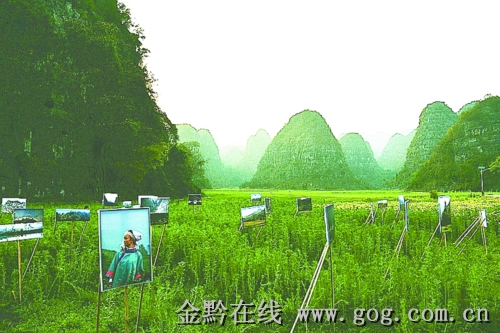 3月18日,兴义市万峰林举行大地影展,来自全州各地摄影爱好者的30多幅摄影作品被分布在田间地里,与万峰林的风景融合在一起。