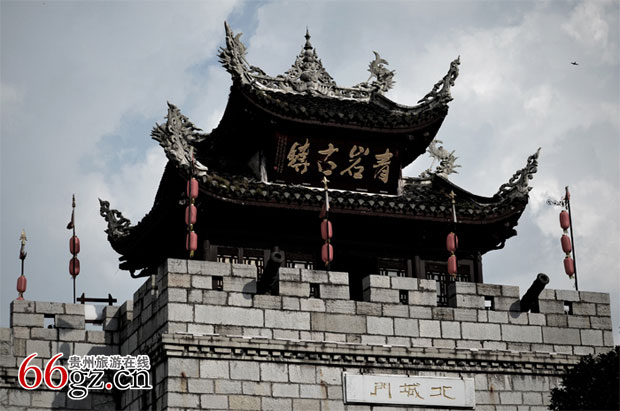 青岩镇依山傍岭,城门城墙全用石头建造,古镇至今仍有保存完好的朝门、腰门以及古老的石柜台、木柜台,古镇四周筑有城墙,分内城和外城,均用方块巨石垒砌,城墙上筑有箭楼、垛口、炮台。气势宏伟的定广门城楼与石板古道、古牌坊交相辉映。城门上大书“定广门”三个大字。城门左右两边有逶迤城墙,上筑敌楼、垛口、炮台,全部用方块巨石筑就,巨石呈现一派青灰苍黑,古镇盎然之意就来自这苍然青石,青岩故由此得名。 一条条纵横四方的青石板路和弯曲狭长的小巷,无不引人发思古之幽情。