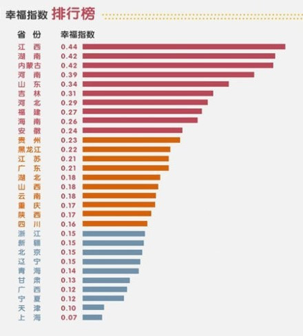 和讯网推出《全国各地幸福指数》数据报告(数据来自于国家统计局,不包含港澳台及西藏自治区),结果显示江西、湖南、内蒙古位列全国前三。计算公式包括五项数据——就业与价格指标、房价承担指标、税收承担指标、城乡差距指标与空气质量。五项数据相乘得出结果,江西为0.44,上海为0.07。