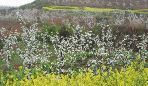 在油菜花的衬托下,雪白的梨花与身穿少数民族服装的少女相映成趣