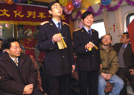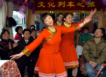 1月25日,几位列车员在贵阳开往北京的t88次“文化之旅”列车上向旅客们表演少数民族歌舞。