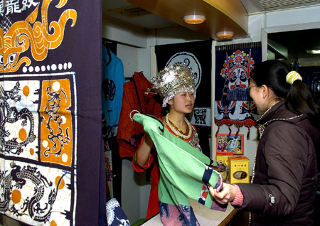 1月25日,一位身穿苗族服饰的列车员在贵阳开往北京的t88次“文化之旅”列车超市向一位旅客介绍贵州土特产蜡染制品。