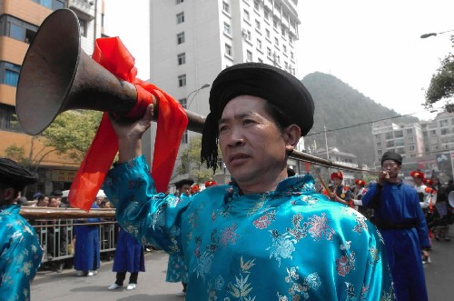 3月27日,在贵阳市花溪首届农民文化节游行演出活动中,当地的苗族群众吹起了长唢呐。