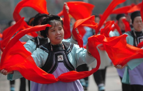 3月27日,在贵阳市花溪首届农民文化节游行演出活动中,当地的布依族群众跳起了欢快的舞蹈。