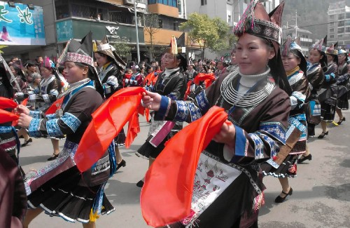 3月27日,在贵阳市花溪首届农民文化节游行演出活动中,当地苗族群众跳起了欢快的舞蹈。新华社记者 杨楹 摄