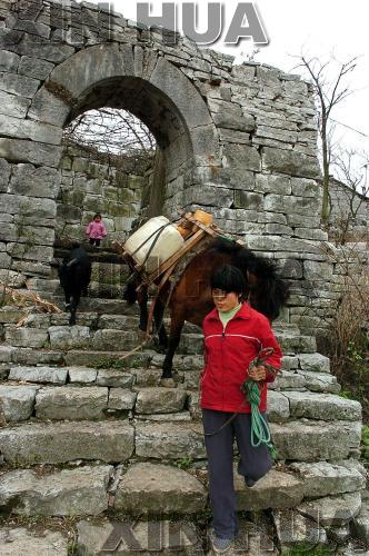 燕楼古营盘唯一住家的女主人正牵着一匹马“出城”,到山下取水。